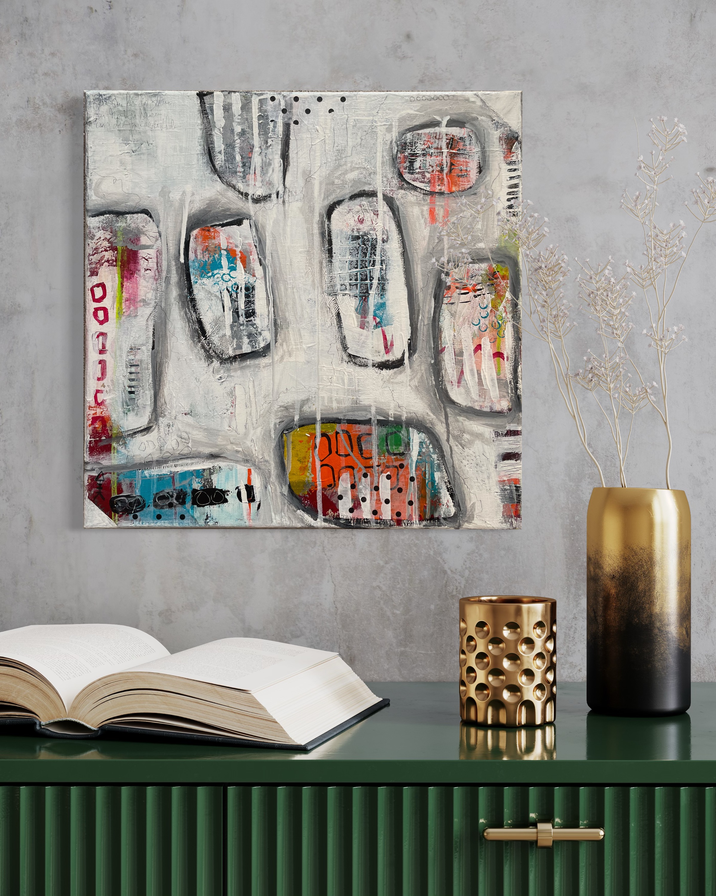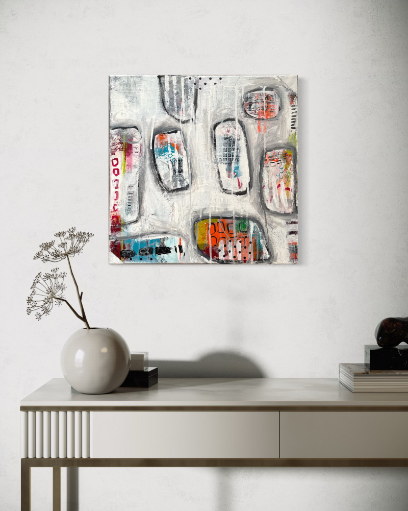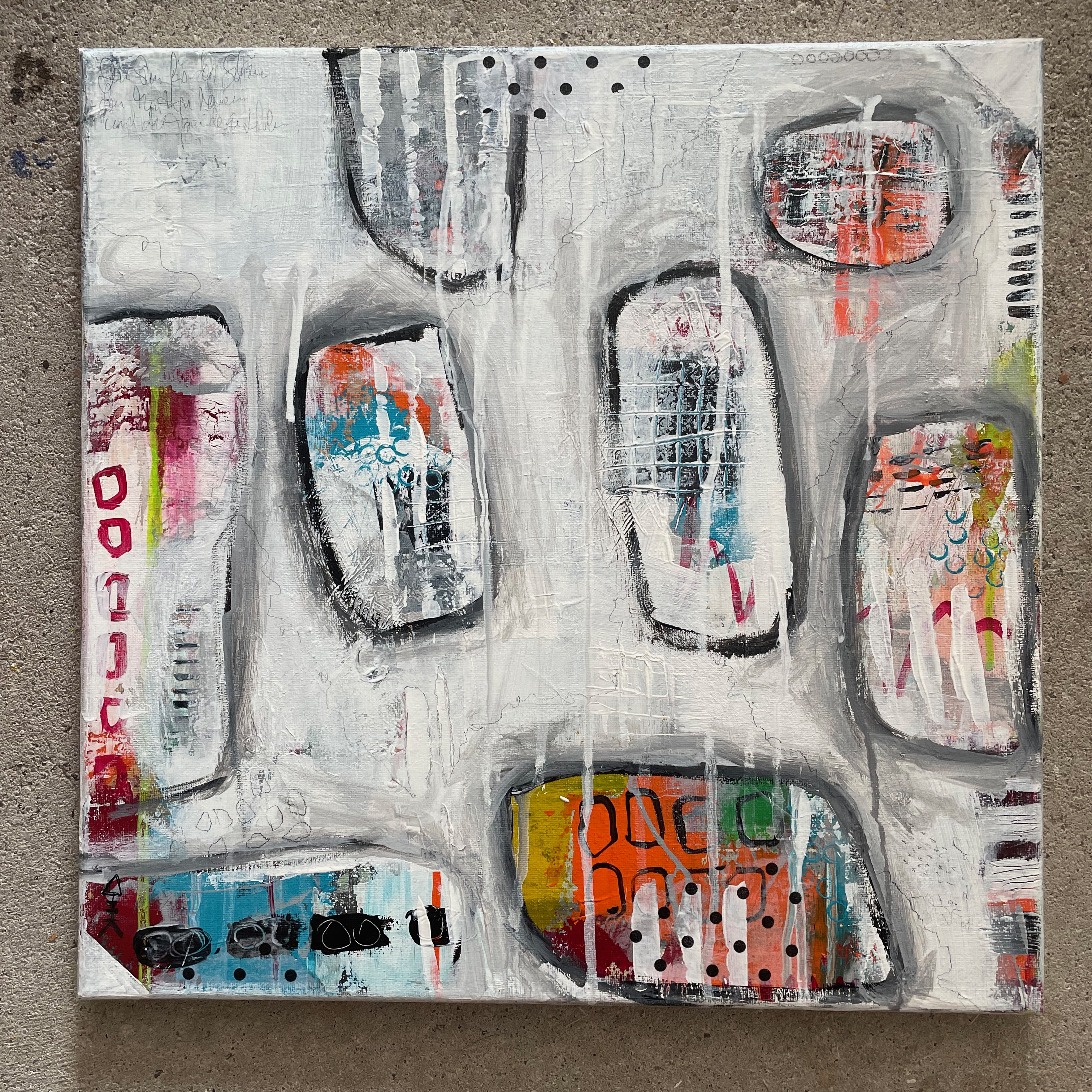 Amoeba Amöben sind Einzeller und man liest nichts Gutes über sie. In meiner Fantasie sind Amöben lieb und hübsch.Acryl - Mixed Media - Collage - Leinwand auf Keilrahmen Abmessungen Breite: 40 cm, Höhe: 40 cm Dicke: 2 cm 190 € Verfügbar Besichtigungs-/Kaufanfrage Email Telefonnummer Name Nachricht